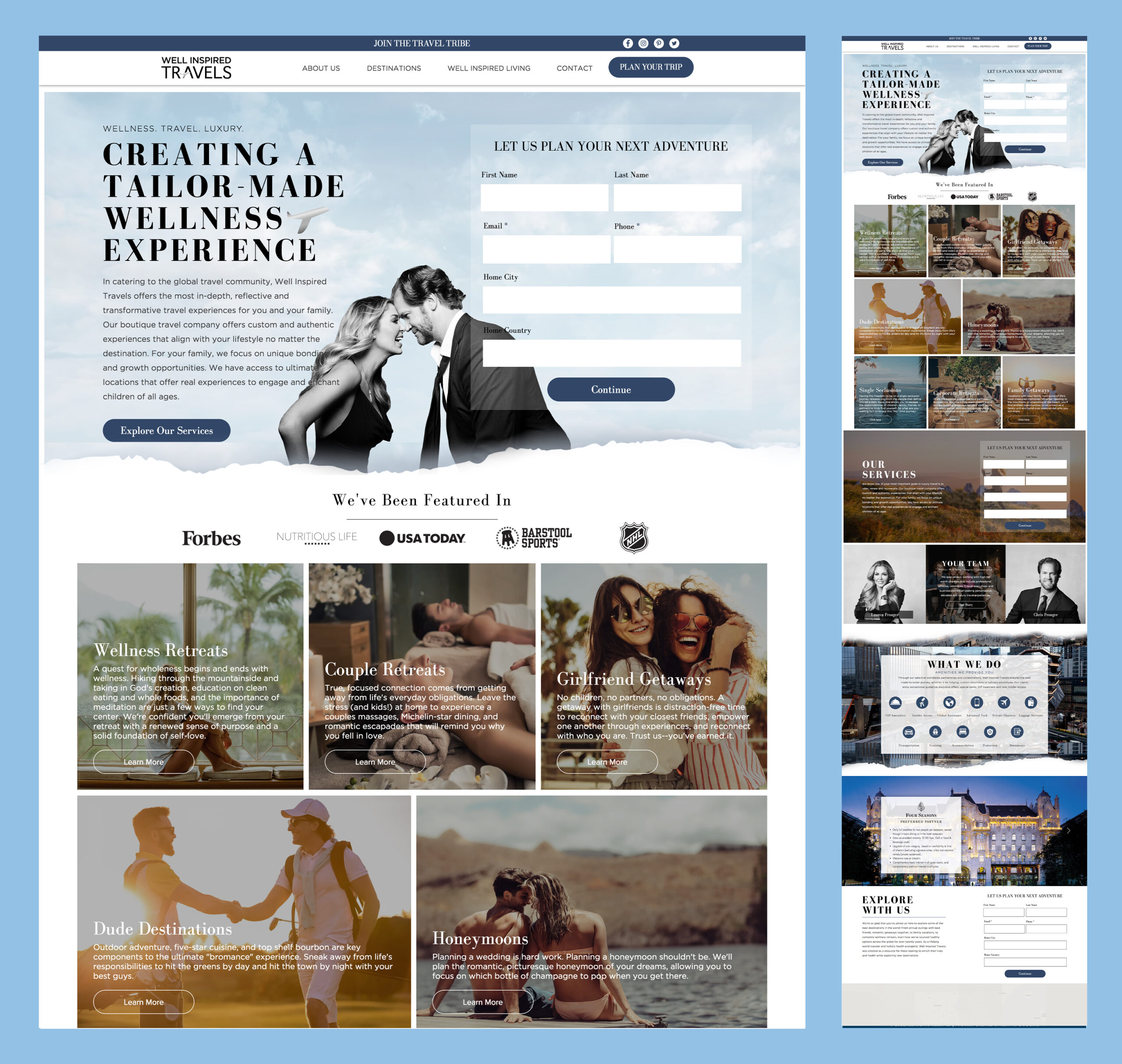 This website was for former NHL player Chris Pronger and wife Lauren Pronger who created a brand based on travel, family, health, and wellness. We highlight their journey and expertise in these areas, while seamlessly integrating their personal brand. This website not only enhanced their online visibility but also helped them secure more partnerships and grow their social media following.